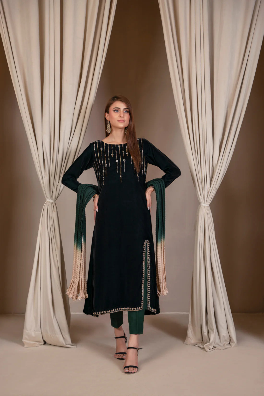 On a flawless dark green canvas, this artfully created pieces has embellished front and sleeves. This open side slit shirt effortlessly captures attention. Elegantly adorned with flowery sequins, pearls and handmade accents along with crushed dupatta with gotta onit and cigratte pants to complete the look.
