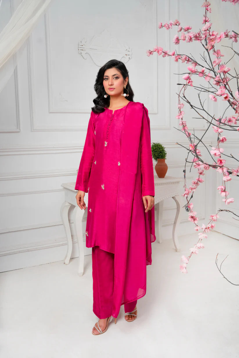 Epitome of grace this shocking pink canvas with a spray of diamantes and kundan at the front is paired with silk dupatta which is giving a true regal look. Trouser is included.
