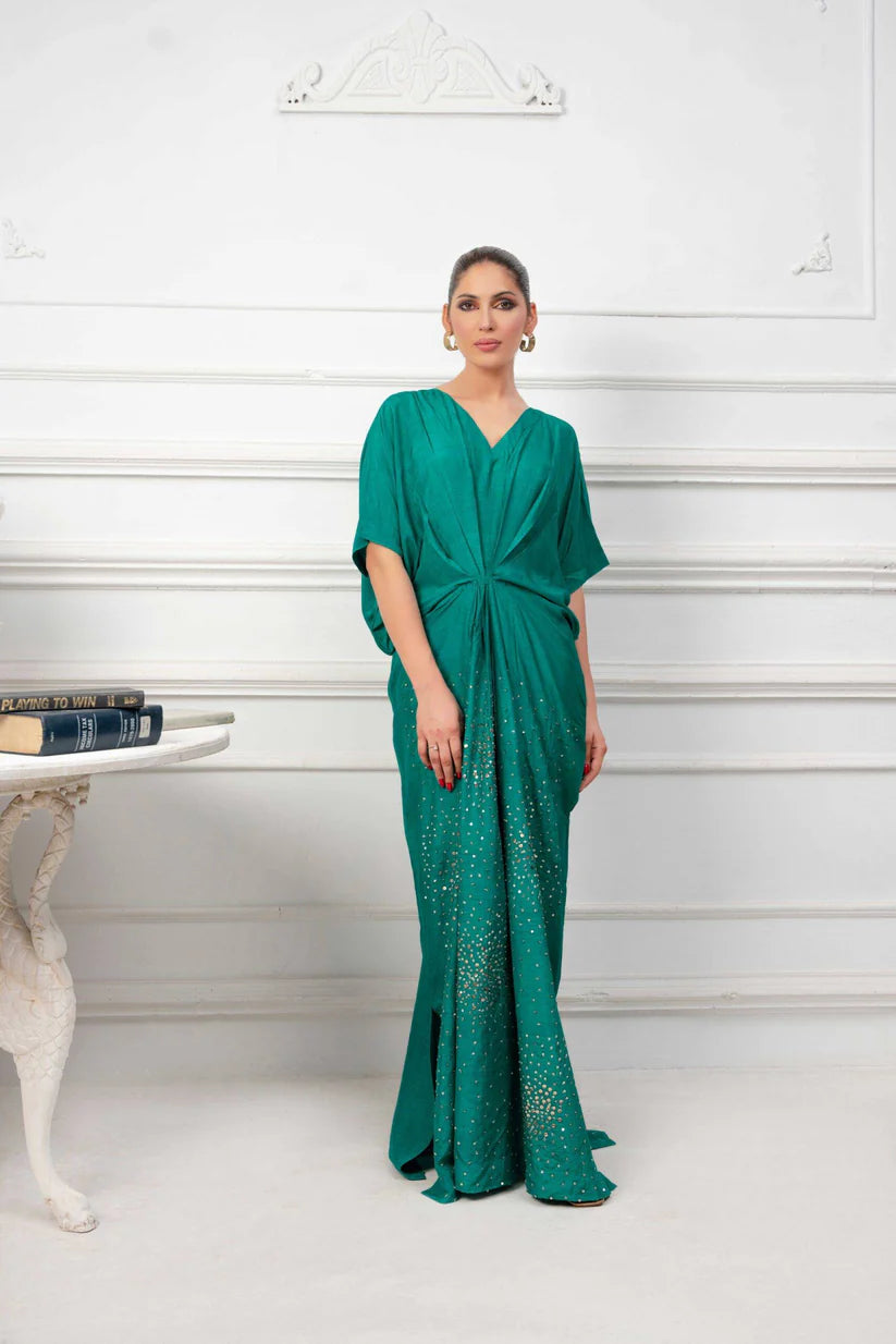 Perfect ensemble for your next event. Alora is an emerald green kaftan with celestial detail of sequin spray at front giving it an opulent dreamy look.