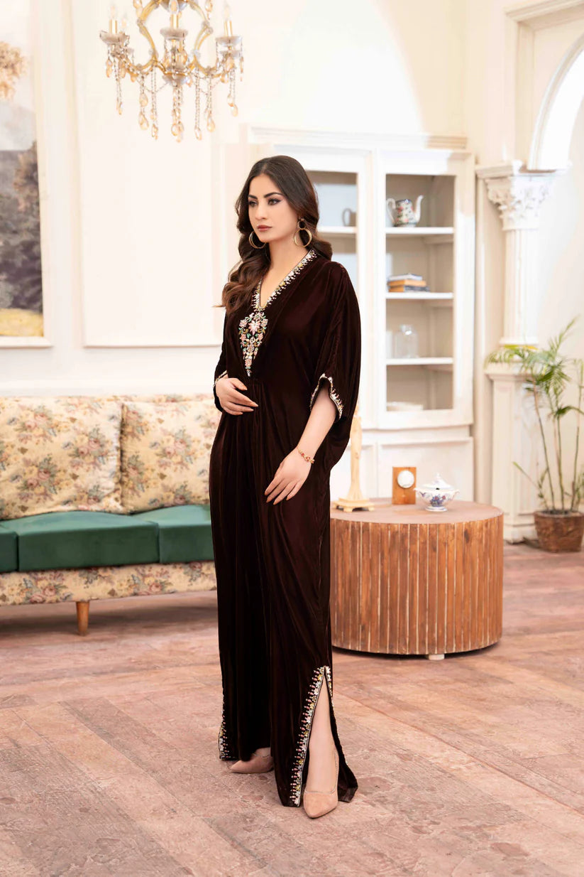 A mesmerizing beige kaftan is opulently curative with naqshi, dabka and embroidery and cutwork at neckline and...