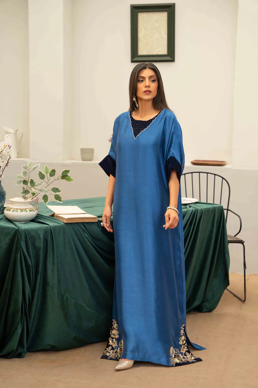 A royal blue kaftan with along, flowing silhouette and velvet detailing is a vibrant and luxurious choice that combines the rich blue color with elegance. The neckline and hemline are intricately hand embroidered.