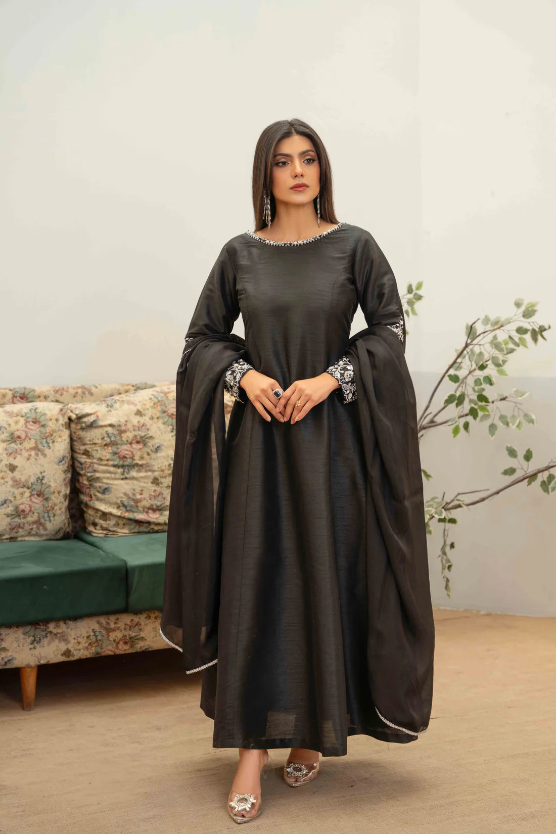 Contemporary and chic, this black frock would give you a classic style which has an exquisite floral tilla embroidery and hand embellishments with delicate multi stones on sleeves and neckline. Paired with Dupatta and Cigarette Trouser.