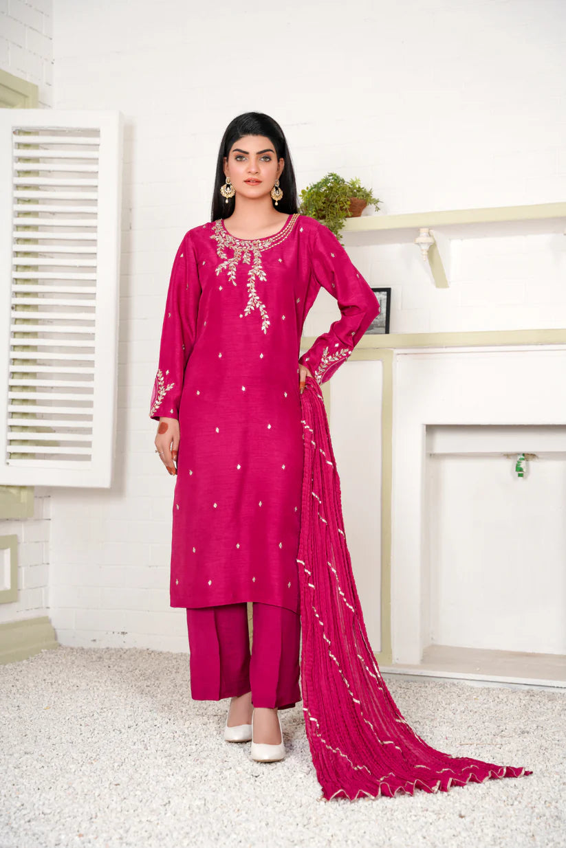 A beautiful magenta color outfit has embelisshed on neckloine and sleeves with gotta work and hand embroidery with stones and swarovski and crushed dupatta with gotta detailing on it. Trousers included.