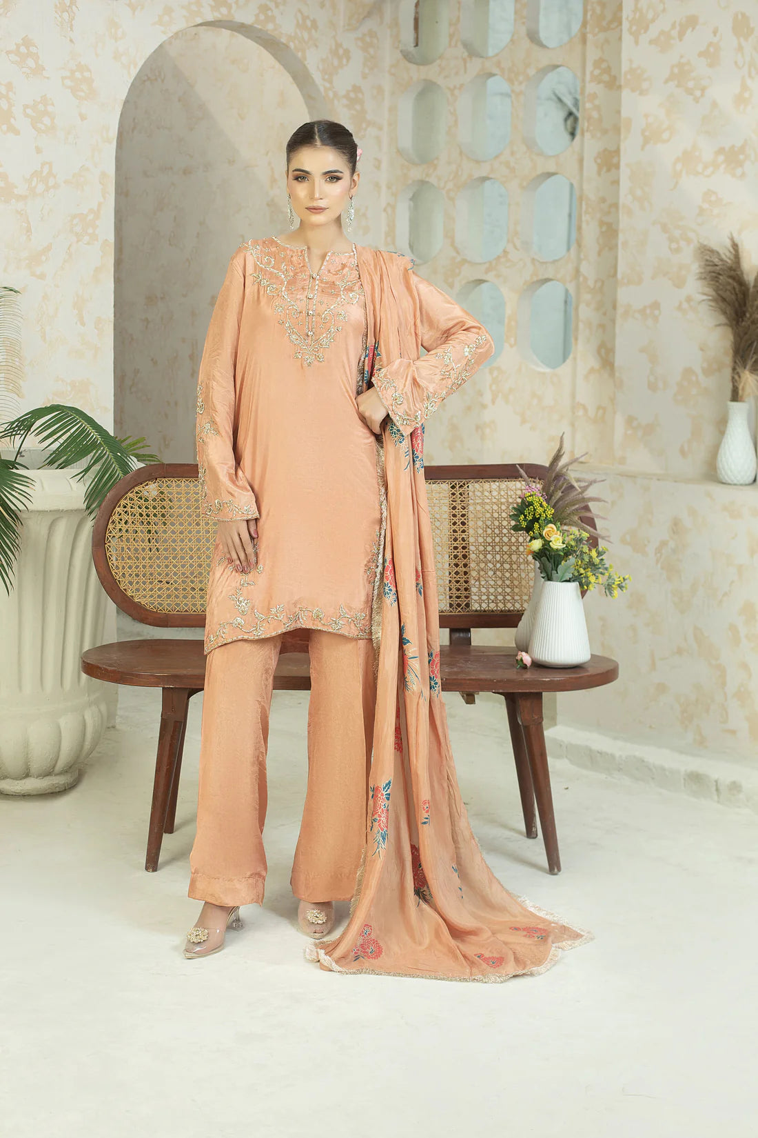 A three piece stitched outfit including shirt, shalwar and dupatta. Shirt is meticulously embroidered and hand embellished till and stone work on neckline and sleeves. Paired with block printed farshi shalwar and dupatta.