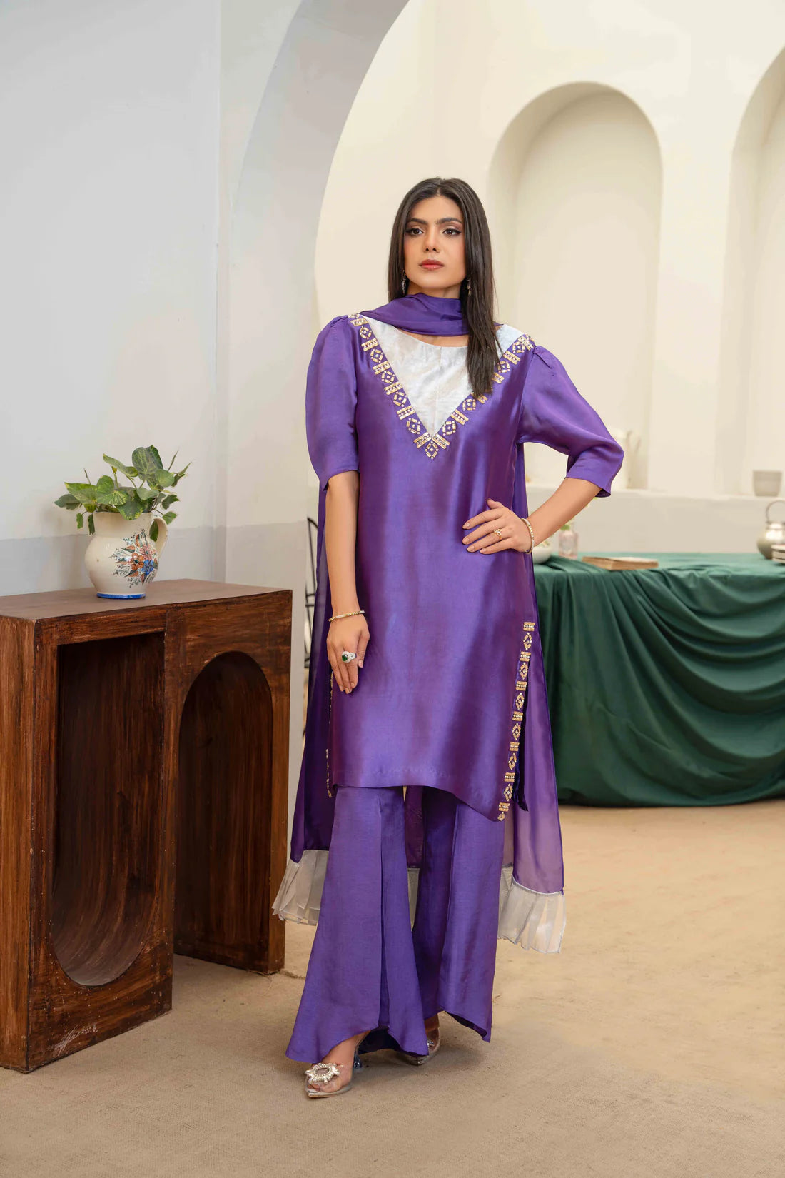 Elevate your style with this indigo outfit which is meticulously hand embellished with swaroski and stones on neckline and hemlines. Styling dupatta with shimmer details and flared trouser included.