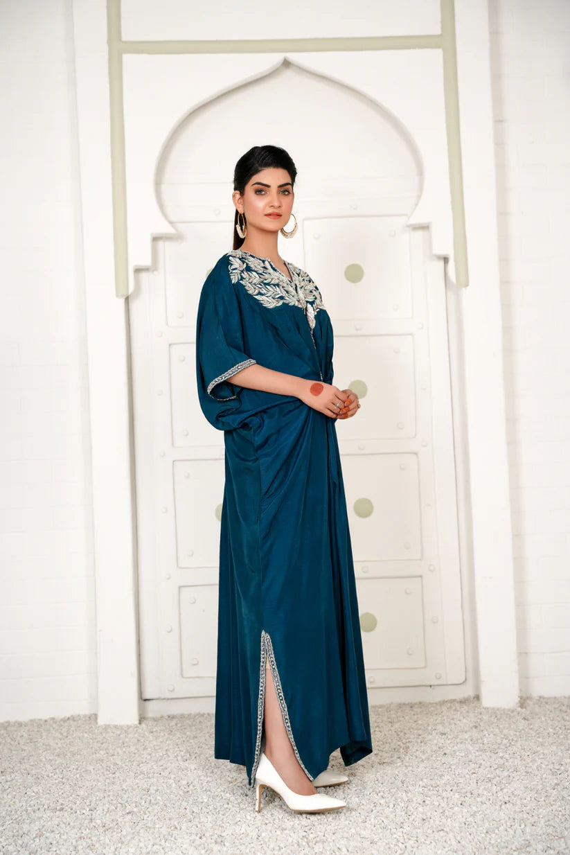 Elevate your style with this exquisite teal kaftan is opulently curated with elegant embroidery with crystals, sequins, nakshi and dabka on neckline, sleeves and side slits which give you a perfect look.