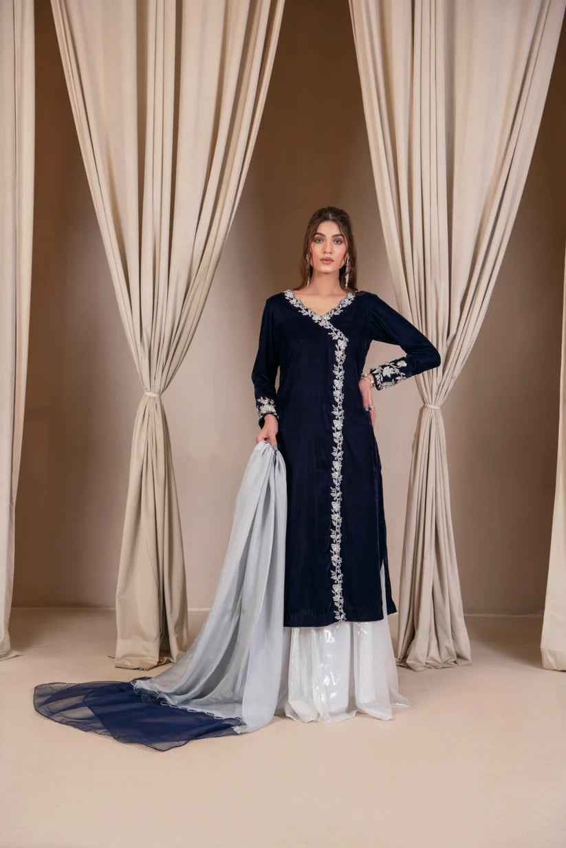 A mesmerizing blue Angrakha shirt embellished with elegant tilla work, naqshi dabka, pearls and crystals. Stylise with shinny silver lehnga and silk dupatta.