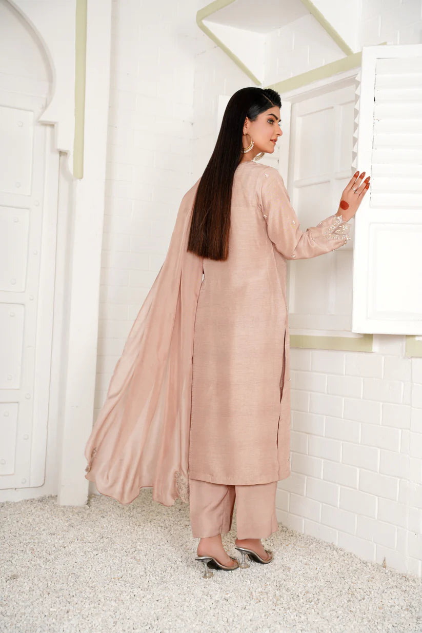 A meticulously hand crafted with embroidery on neckline and sleeves with everlasting elegant attire. Paired with silk dupatta and trousers.