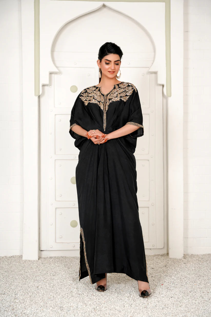 Elevate your style with this exquisite black kaftan is opulently curated with elegant embroidery with crystals, sequins, nakshi and dabka on neckline, sleeves and side slits which give you a perfect look.