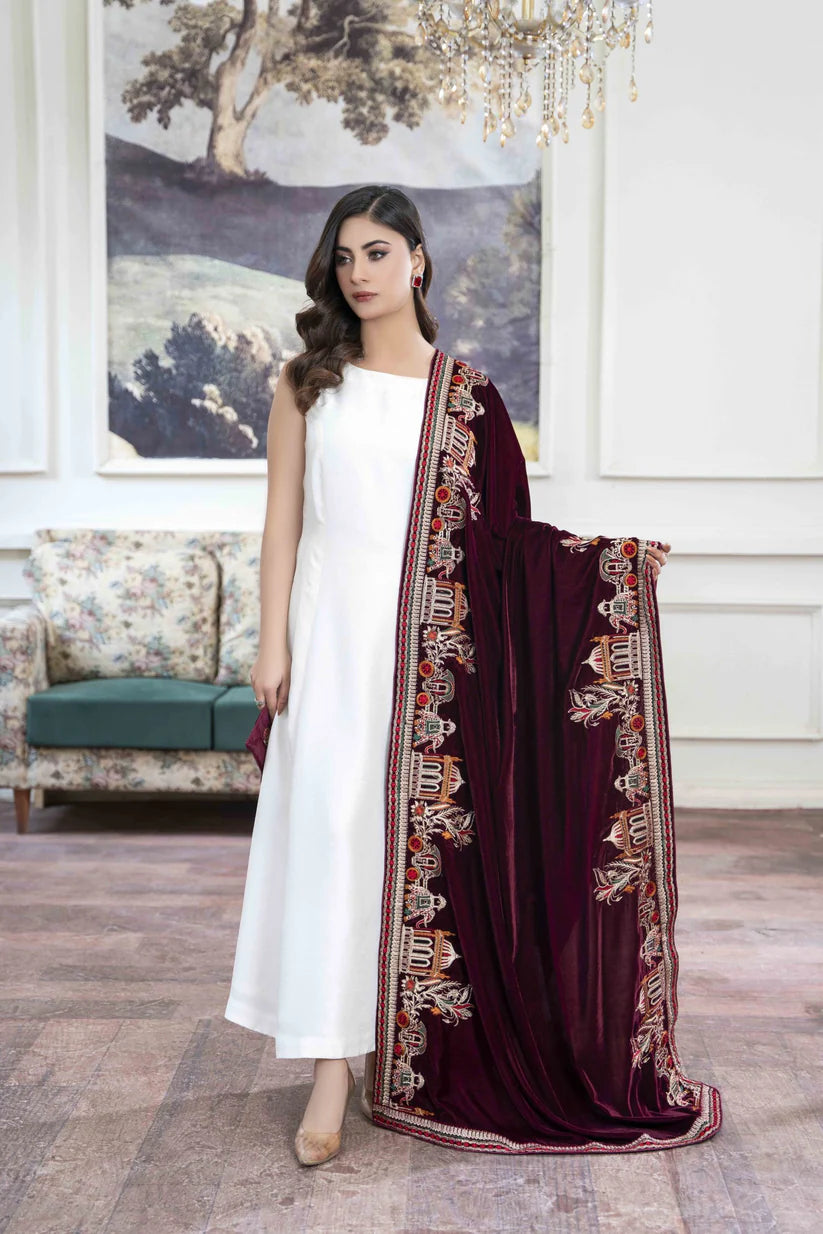 Modern or traditional, acquire an enticing look by adding this alluring and luxurious maroon velvet shawl adorned with intricate embroidery and tilla finishing, leaving an unforgettable impression.